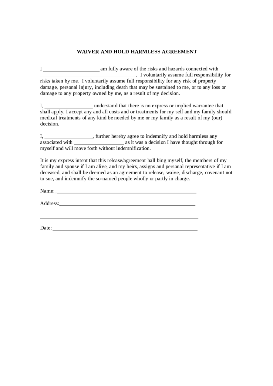 Printable Blank Hold Harmless Agreement Pdf Printable Form Templates
